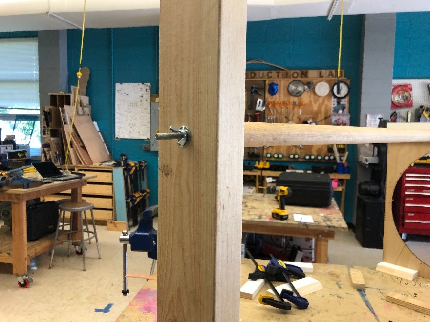 We drilled a hole into both ends of the rod a few inches deep, fit the threaded rod, and secured with epoxy. The dowel rod was positioned and secured with wing nuts and washers. |