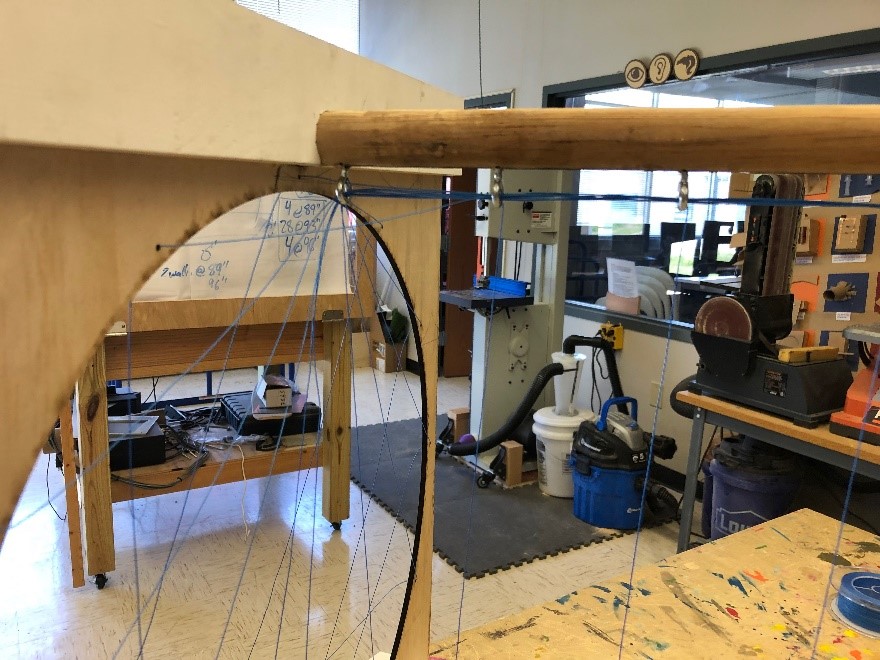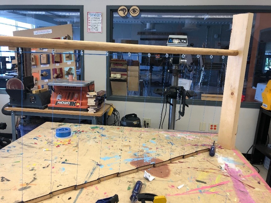 We drilled pilot holes into the dowel rod, 3.5" apart and screwed in eye bolts. We laser cut the segments that would make the wave. These were pill shaped with holes at each end. These were connected together with hext bolts and washers. String was tied at each "joint", run through the eye bolts, and strung around the holes in the wood sheet. |